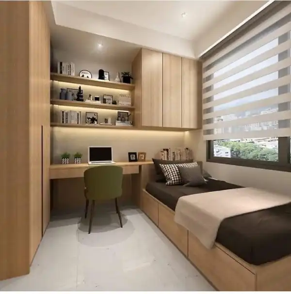 Terapkan Zonasi Ruangan: Bagi area kamar menjadi beberapa area fungsi yang jelas. Pisahkan area untuk tidur, meja kerja, dan ruang penyimpanan pakaian.