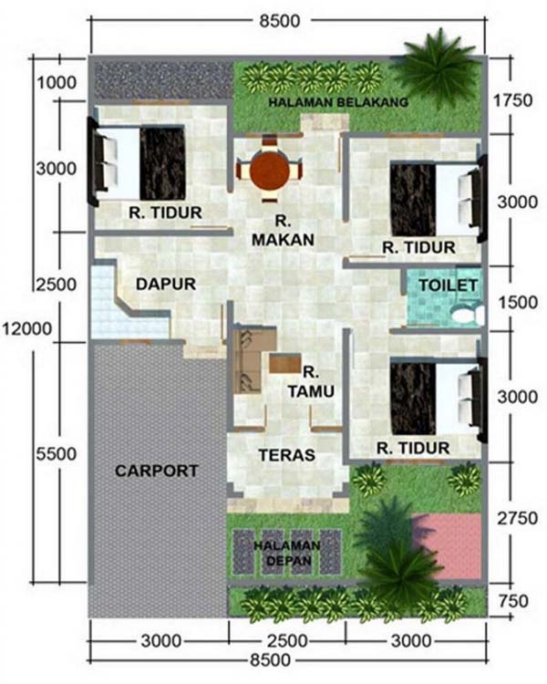 Denah rumah 8×12 yang menempati tempat dengan lebar 150 m2 betul-betul baik untuk dibuat 3 kamar tidur. Kamar tidur khusus yang ditempati oleh orang-tua memiliki ukuran paling luas dan dilengkapi dengan toilet en suite.