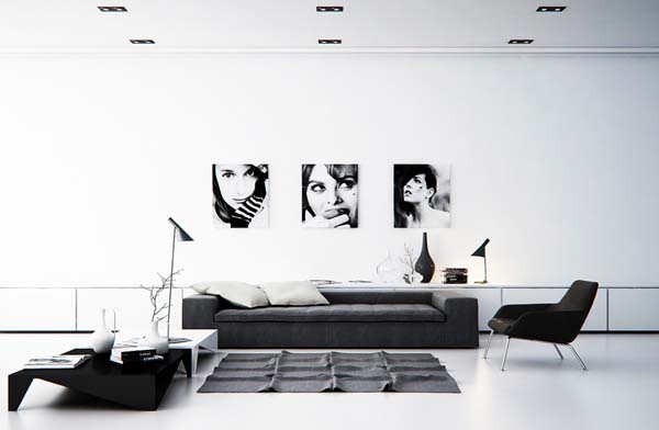 Ruang tamu dengan konsep hitam putih dapat dijadikan pilihan yang menarik, gunakanlah cat tembok putih untuk menonjolkan kesan yang luas, kemudian pilihlah dekorasi/furniture dan pernak-pernik berwarna hitam untuk menonjolkan kesan yang kontras pada ruangan.