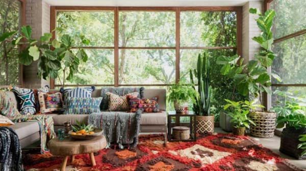 Anda dapat lakukan eksplorasi dan membuat ruangan Anda memiliki gaya alam yang bebas. Manfaatkanlah perpaduan di antara karpet warna cerah yang tebal dengan tanaman hias yang pas untuk di rumah. Pilih tanaman yang mudah untuk dirawat dan daunnya yang tidak mudah rontok.