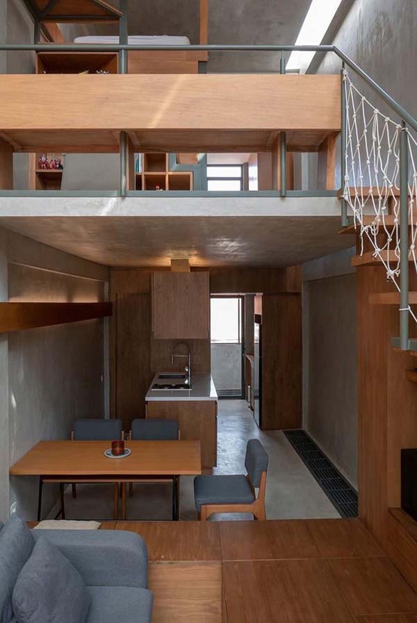 Selain itu, Abimantra juga menggunakan mebel multifungsi, dengan membuat meja di ruang keluarga sebagai tempat penyimpanan dan juga lantai menuju ruang makan. Keren banget, ya!