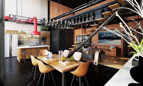 Penerapan desain industrial yang dikombinasikan dengan desain open plan membuat ruangan ini makin cantik. Kamu bisa membiarkan tiap ruangnya terbuka seperti pada gambar dengan menggunakan tangga tanpa railing sebagai sekatnya.