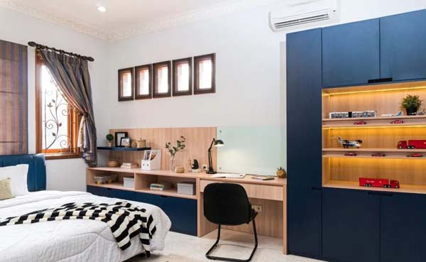 Ide kamar tidur ini mempunyai keelokan tertentu, yakni skema di antara jendela kayu khusus dengan ventilasi lubang angin pada bagian atas meja kerja. Komplet dengan teralis pola pada jendela kayu khusus, situasi kamar akan menjadi lebih fresh dan estetik.