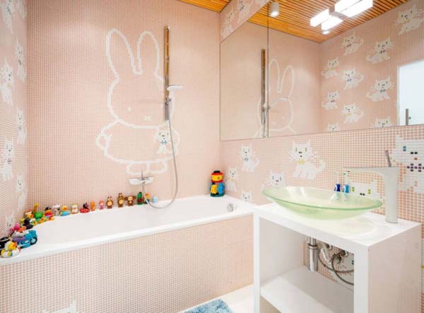 Tidak cuman situasi, watak kartun juga disukai oleh anak. Satu diantaranya ialah Desain kamar mandi ini. Keramik yang terpasang dengan skema mozaik berupa watak kartun kelinci namanya Miffy. Watak ini terpasang di tengah-tengah kamar mandi.