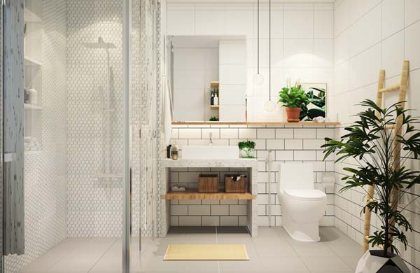 Konon katanya, sebuah rumah akan terbilang bersih bila memiliki kamar mandi yang bersih juga. Bersih biasa identik dengan warna putih. Supaya hal ini bisa terasa efeknya, aplikasikan warna putih pada dinding kamar mandi. Gunakan rak dinding kayu dan beberapa tanaman hijau di ruang minimalis tersebut. Cara ini dilakukan supaya kamar mandi lebih terasa alami.