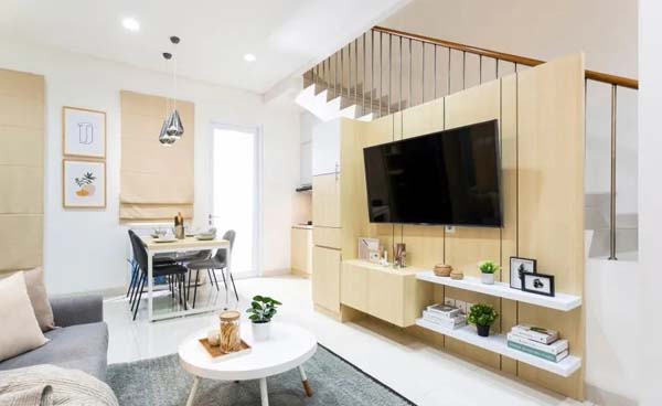 Agar semakin optimal dan space-saving, gunakan ruangan pada bagian bawah tangga! Kamu dapat jadikan tempat itu sebagai tempat menempatkan meja TV dan pirantinya atau sebagai almari penyimpanan.