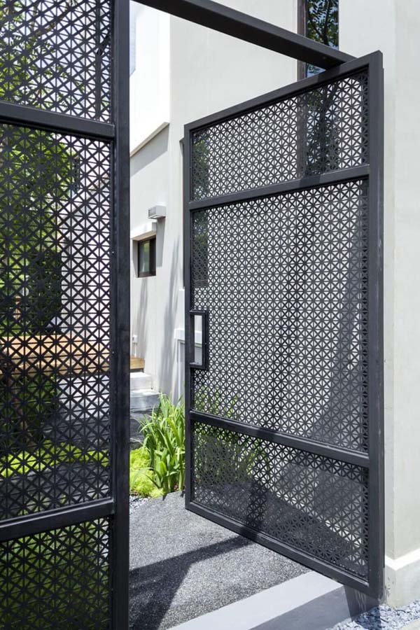 Memadankan antara elemen kayu dan tanah dari semen, pintu pagar dorong ini membuat nuansa hangat dan nyaman pada tempat tinggal. Selain itu, area pintu juga terlindungi dari hujan dan sengatan sinar matahari hingga rumah jadi benar-benar homey.