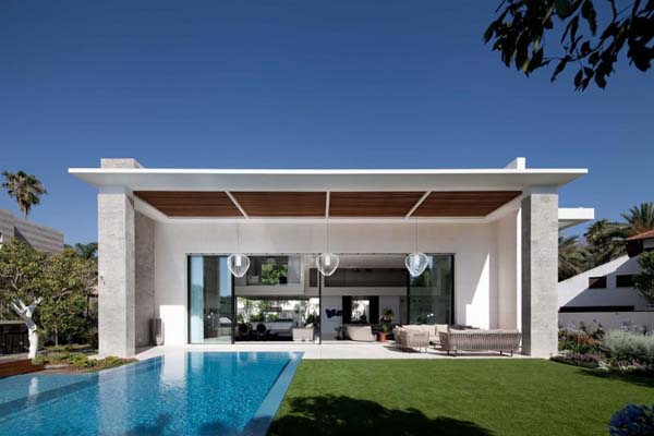 Rindu dengan desain rumah bergaya elegan tanpa melupakan segi klasiknya? Desain rumah kolam di atas bisa kamu jadikan pilihan. Konsep ruangan keluarganya yang terbuka langsung terhubung dengan kolam renang.