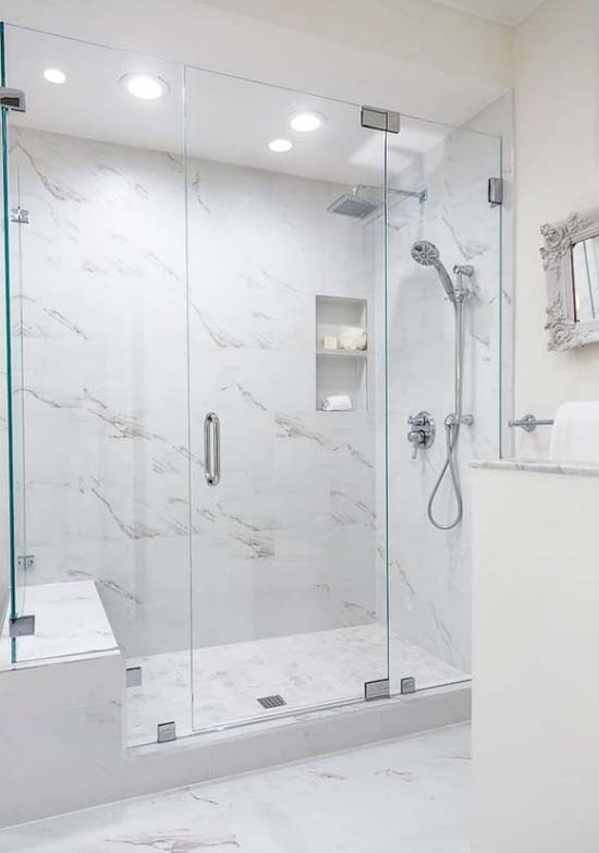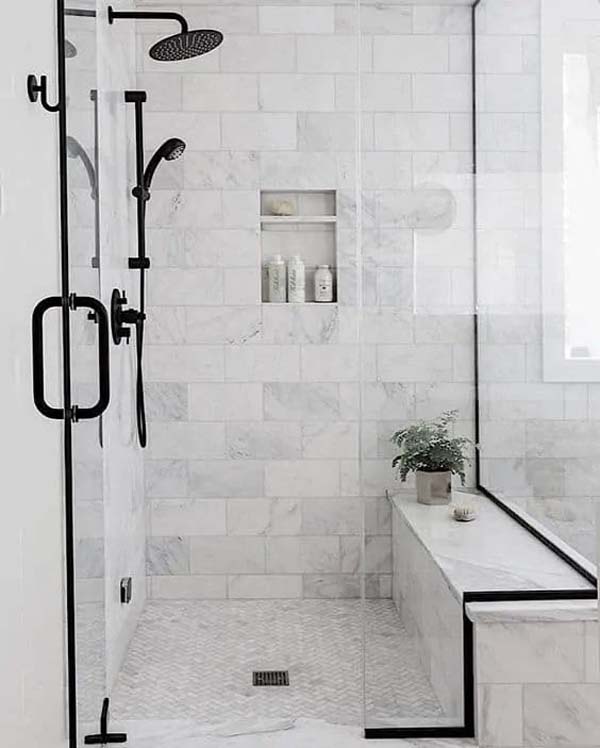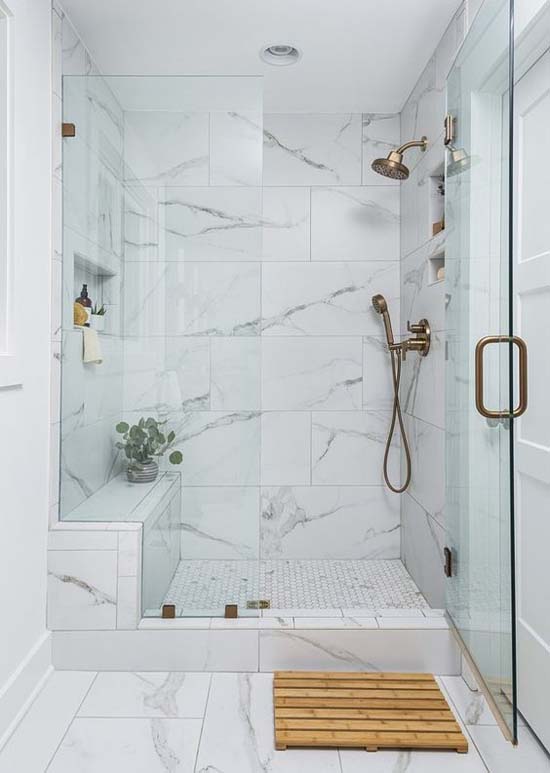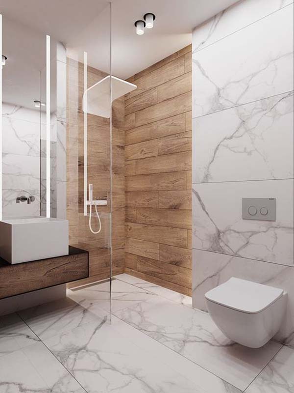 Mengaplikasikan rain shower dua arah akan membuat aktivitas mandi jadi lebih fun. Untuk lengkapinya, seharusnya aplikaskan dinding marmer warna abu digabungkan lantai keramik.