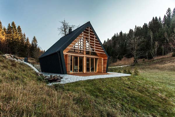 Sebuah hunian kayu modern yang seakan ada dari halaman buku dongeng anak-anak, hunian ini dikuasai dengan panel baja hitam di sisi bagian dan atap. Perpaduan material di antara baja hitam dengan kayu cokelat memberi kesan modern yang tidak terpindahkan.